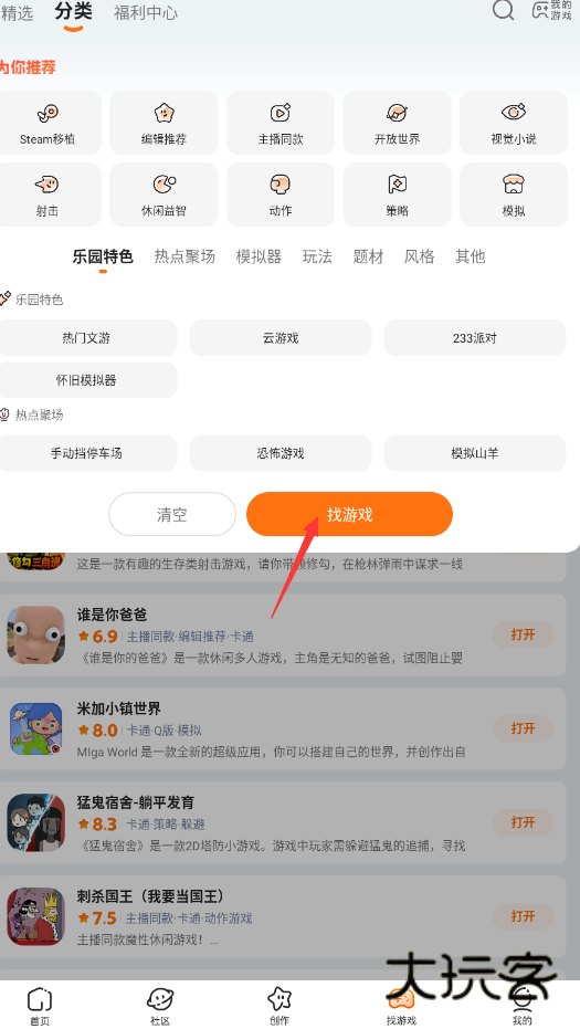 2.想找特定类型的游戏,可以点击“找游戏”页面。