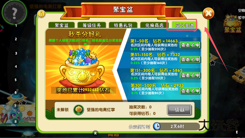 1、进入瓜分奖池界面,了解各名次区间的奖励比例,例如前50名能获得奖池0.5%的钻石,需至少抽奖200次,通过增加抽奖次数提升排名,从而获取对应区间的钻石奖励。