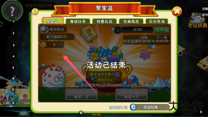 2、在聚宝盆抽奖页面,点击“抽奖一次”或“抽奖十次”积累次数,这些次数会关联瓜分奖池的排名,抽奖过程中可能触发单次5000钻石的大奖,奖池累计金额会实时更新。