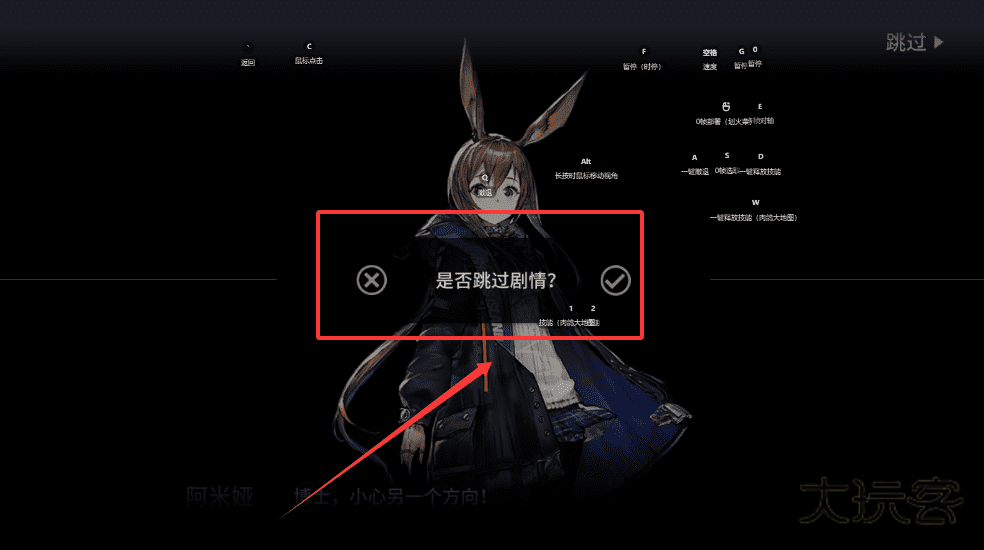 4、剧情跳过时找屏幕中央红框,选勾号确认或点右上角跳过按钮就行。