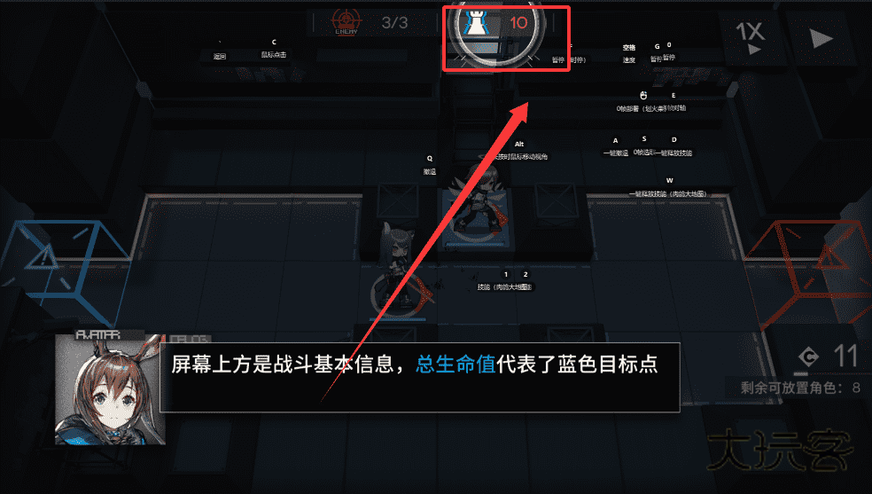3、留意上方生命值与蓝色目标点,用q侧移、e近战,熟悉按键操作吧。