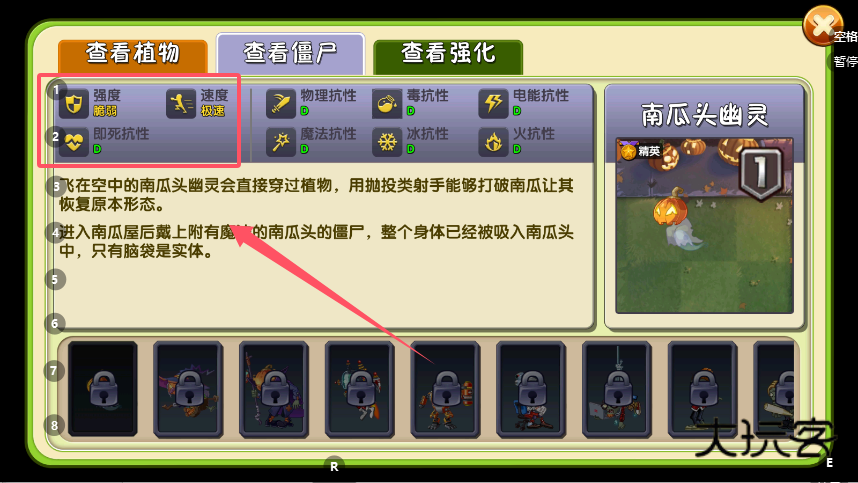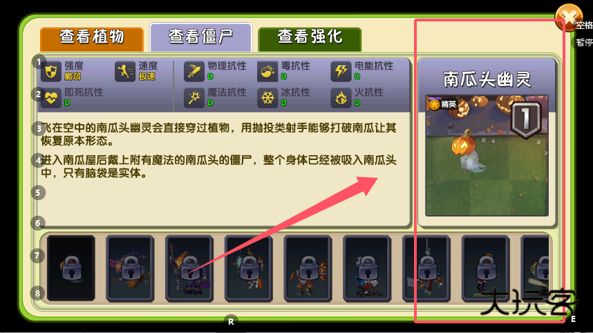 1、在游戏主界面点击进入“图鉴”系统,页面顶部会有“查看植物”、“查看僵尸”和“查看强化”三个选项卡。选择“查看强化”标签后,便能浏览所有可用的游戏内强化道具。