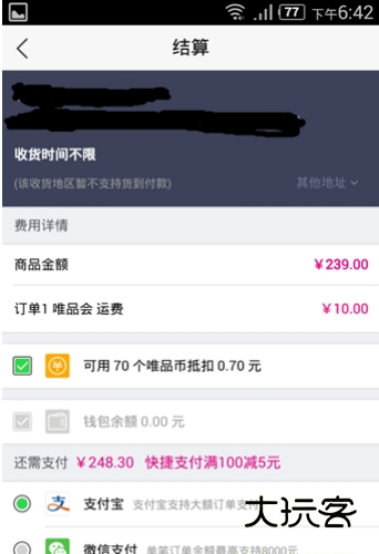 点击“结算”,可看到“可用唯品币折扣”的选项,勾选后点击“提交订单”。
