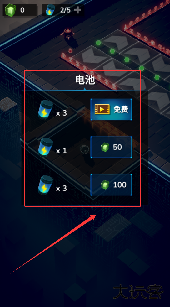 4、例如每天可领 3 次免费电池,也可用 50 金币买 1 个或 100 金币买 3 个,记得先完成日常任务攒够金币再购买。