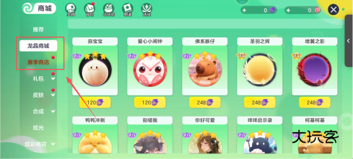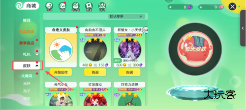 4、打开商城选择界面,点击界面左侧的皮肤按钮,选定所需道具,用于后续的养成或场景互动操作。