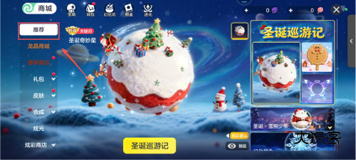 1、点击左侧的推荐玩法入口,进入以雪球为主体的圣诞主题场景,同时可查看界面底部黄色的 圣诞游记”按钮。