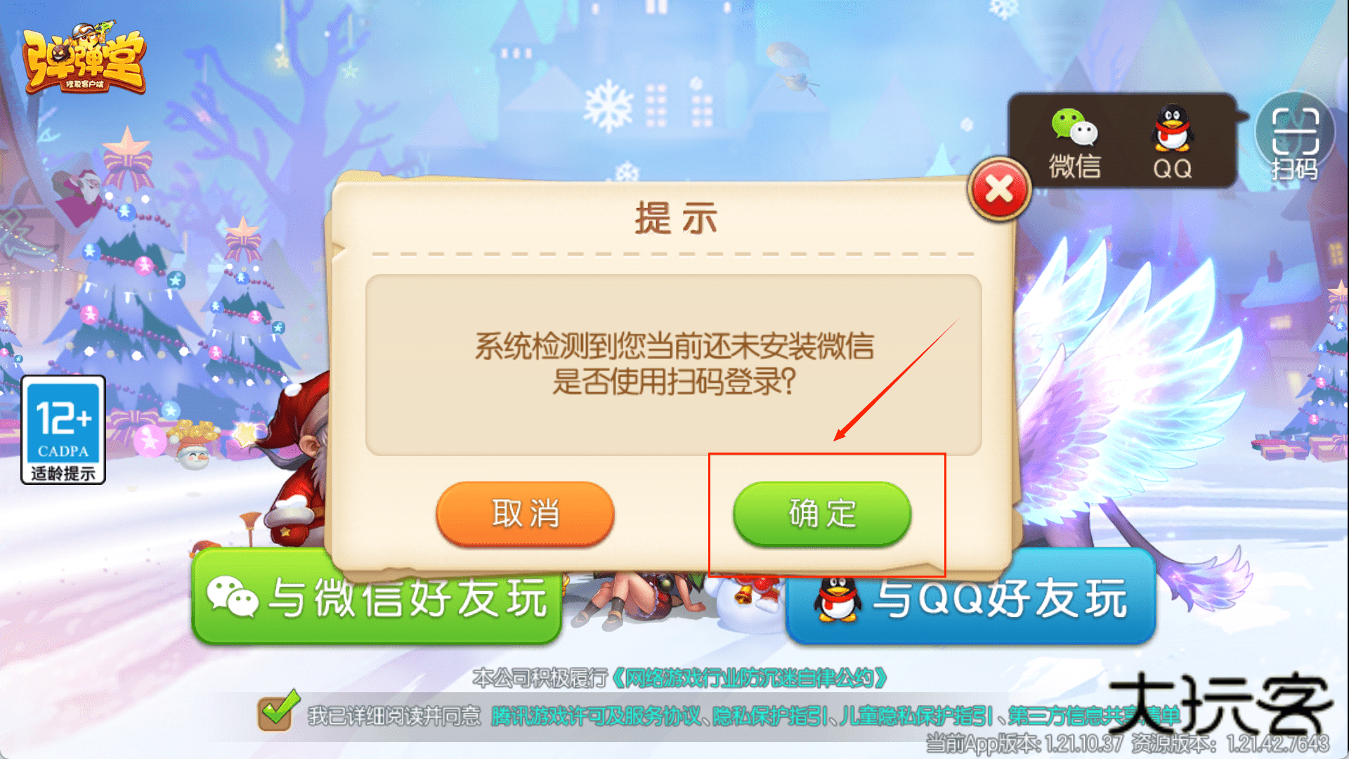 3、登录界面终于展现在眼前,背景是雪地和装饰物。在点击登录按钮前,请先注意游戏左上角的适龄提示信息。之后,在界面下方,选择你熟悉的社交平台按钮进行登录。