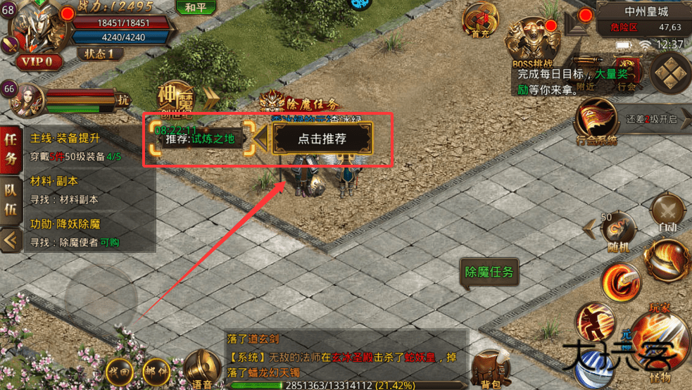 2、在主界面的推荐区域,你可以点击试炼之地,这是获取装备和材料的重要副本。