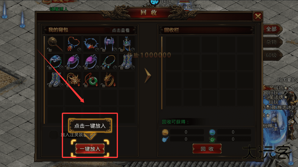 4、打开背包界面,使用一键放入功能将多余装备放入回收栏,点击回收即可换取资源。