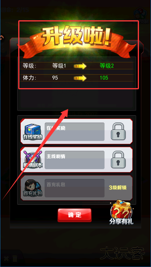 3、想要玩到更多内容就要尽快升级。完成新手指引和主线剧情是最快的途径,升级后像“剧情副本”这些功能就会解锁,体力上限也会提高,就像从95变成105那样。