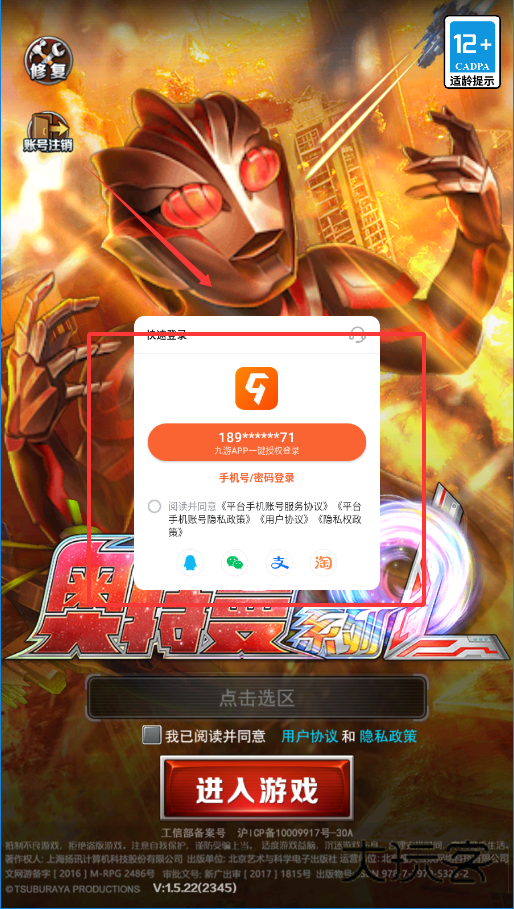 1、游戏一开始是登录页,背景是奥特曼。你可以输入手机号登录,或者用下面支付宝、微信这些第三方图标快速登录,选好后点红色按钮进入游戏。