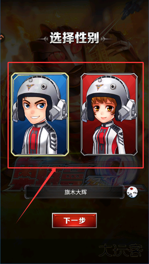 2、创建角色时,在“选择性别”界面挑一个你喜欢的形象,左边是男性右边是女性。角色名默认是“旗木大辉”,点名字旁的小骰子可以随机换名,之后点“下一步”确认。