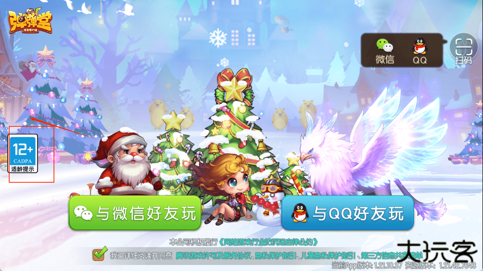 3、登录主界面充满了圣诞元素,很漂亮。在登录前,先看一眼左上角的游戏名称和适龄提示。然后,在界面中下部,你会看到两个大大的彩色按钮,选择一个你喜欢的登录方式点击它。