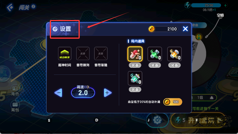 4、调整游戏设置可以优化体验。点击右上角的“设置”按钮进入设置界面。右侧可以装备“局内道具”,设置好后点击“开始游戏”即可应用。