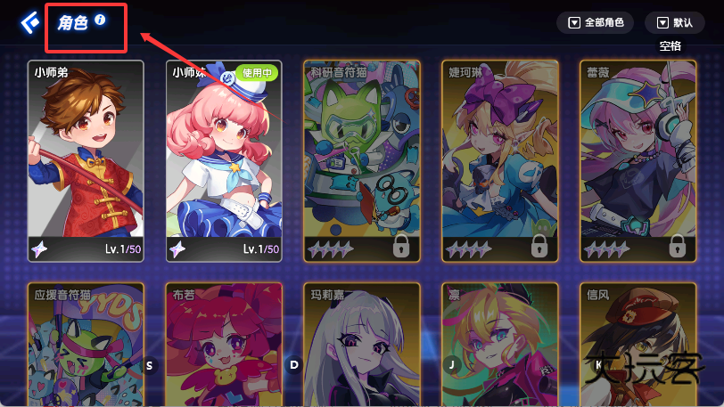 3、如果想更换使用的角色,就点击主界面上方的“角色”按钮。未解锁的角色会有锁的图标。点击一个已解锁的角色,就可以切换到它了。