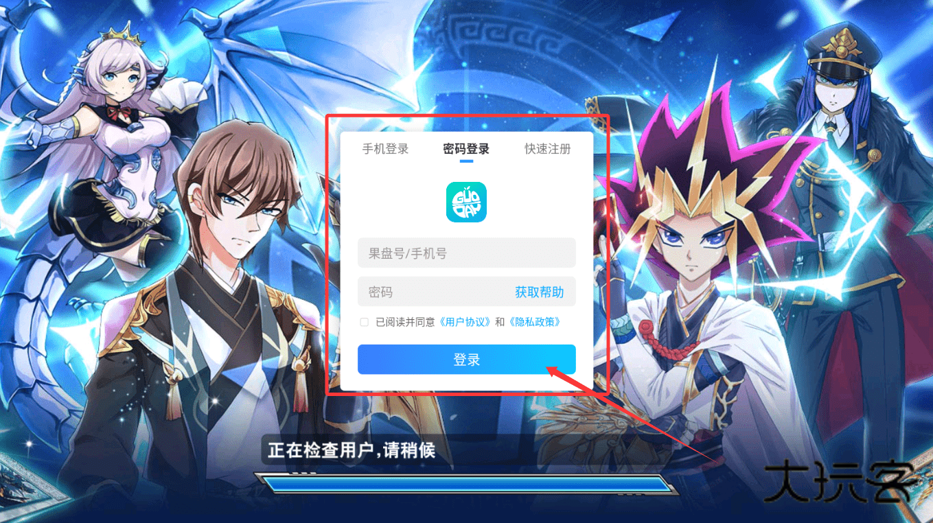 1、启动游戏后需要先完成账号登录,支持手机号或快速注册,在登录前务必阅读并勾选同意用户协议与隐私政策,之后系统会进行用户验证,稍等片刻即可进入主游戏界面。