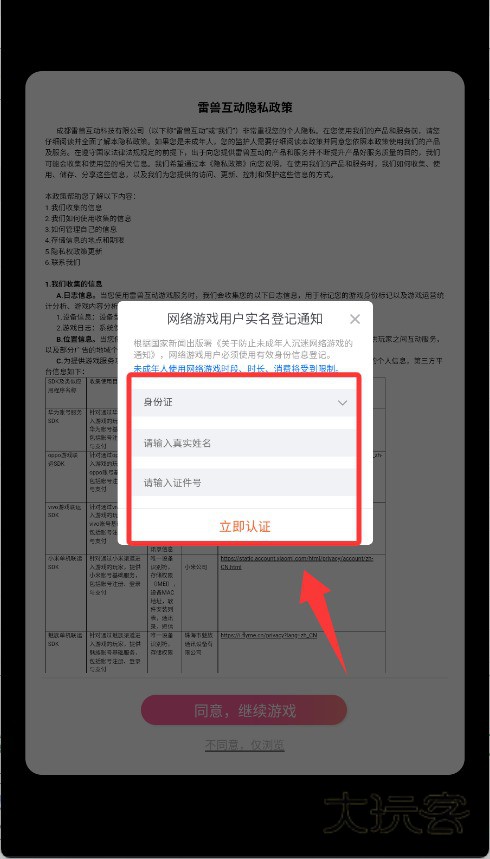 1、启动游戏后,在实名认证界面填写姓名、身份证号等真实信息,提交系统审核。