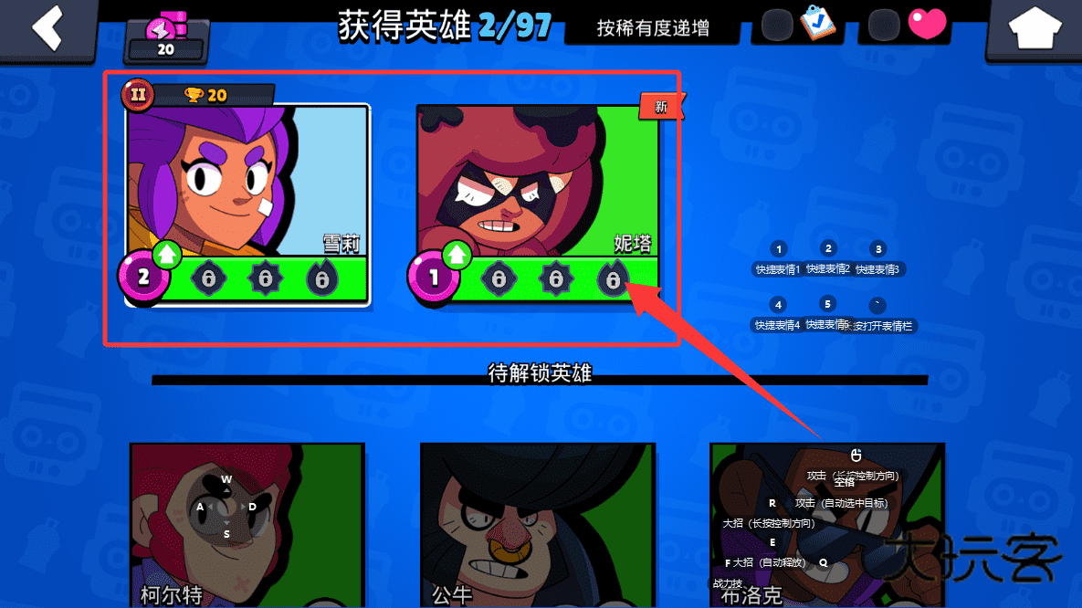 4、英雄收集界面按稀有度排列已获得与待解锁角色,每位英雄配有专属技能说明,例如双击触发特定方向位移或大招需长按控制施放轨迹,操作方式多样。