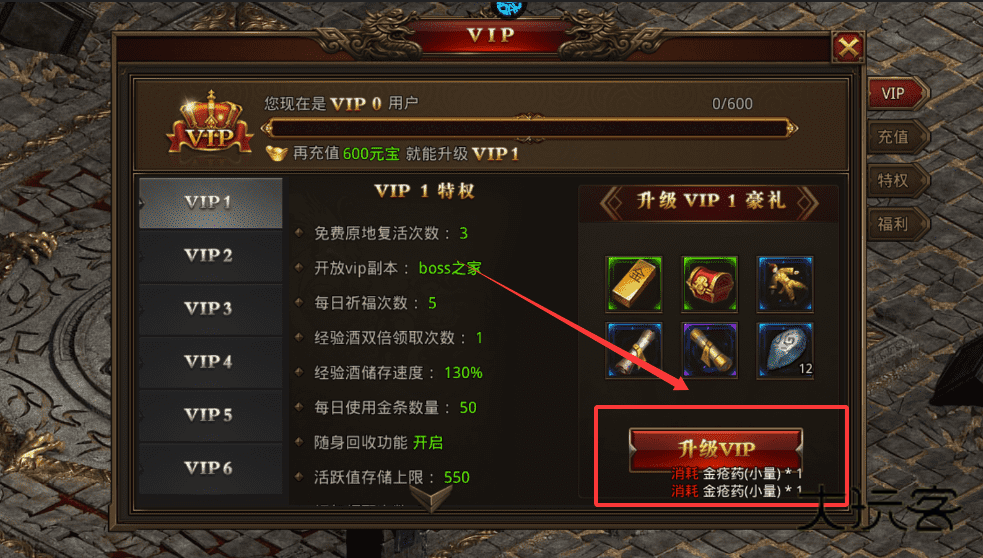 2、在主界面找到VIP入口,查看特权与升级豪礼,使用指定道具即可完成VIP升级。