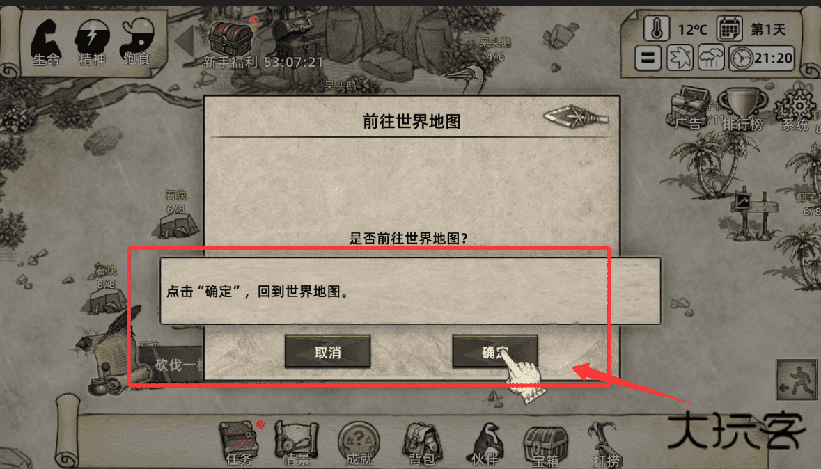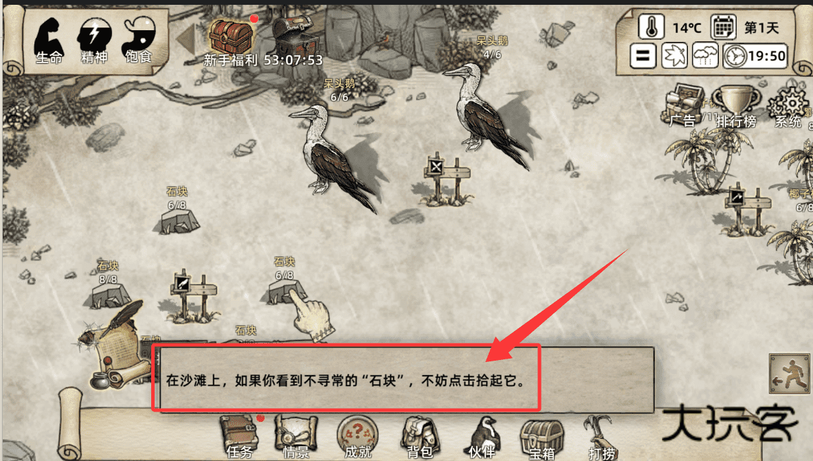 3、根据环境中的文字提示进行基础互动,例如“点击拾起”沙滩上不寻常的石块。此类操作是获取基础资源、完成任务目标及熟悉交互方式的核心环节。