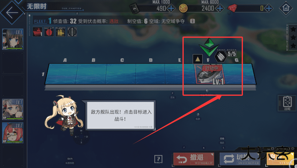 2、地图上有A到G等移动点,点击敌方舰队标志就能进入战斗。如果想撤退或切换舰队,可以使用右下角的对应按钮,避免不必要的损失。