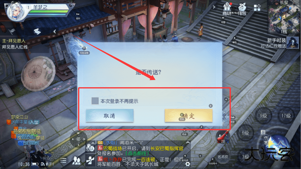 1、如果遇到“走不传送”的提示框,可以选择“本次登录不再提示”并确定,这样下次就不会重复弹出了。