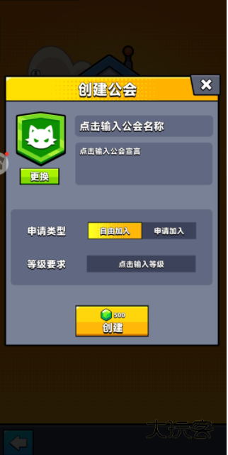 若是选择创建公会,则需要消耗500钻,大家可以选取一个响亮的公会名称,并且可以选择是否自由开放进入还是需申请方能进入,还可对进入玩家的等级进行限制~