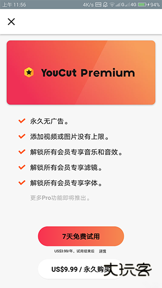 4、youcut是专门为用户打造的手机视频剪辑软件,在这里通过软件在线进行拍摄录像功能,同时在线进行视频滤镜解锁,使用滤镜,剪辑自己的高清视频,同时通过软件进行工具解锁,快来一起剪辑吧