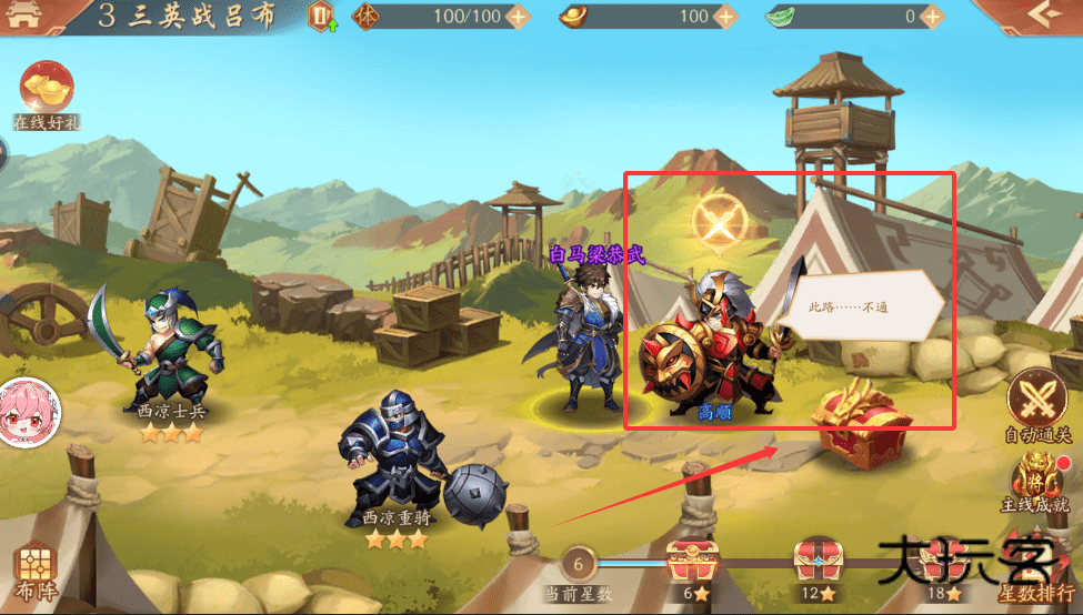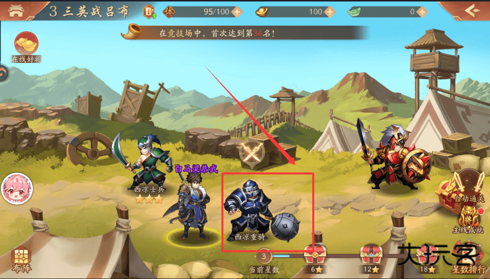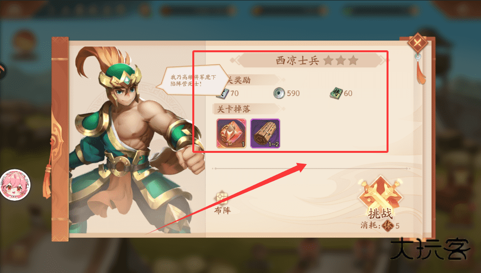 1、可以在布阵界面调整你的队伍阵容,合理搭配武将,准备应对西凉士兵和重骑。点击“挑战”即可开始,每次会消耗5点体力哦。