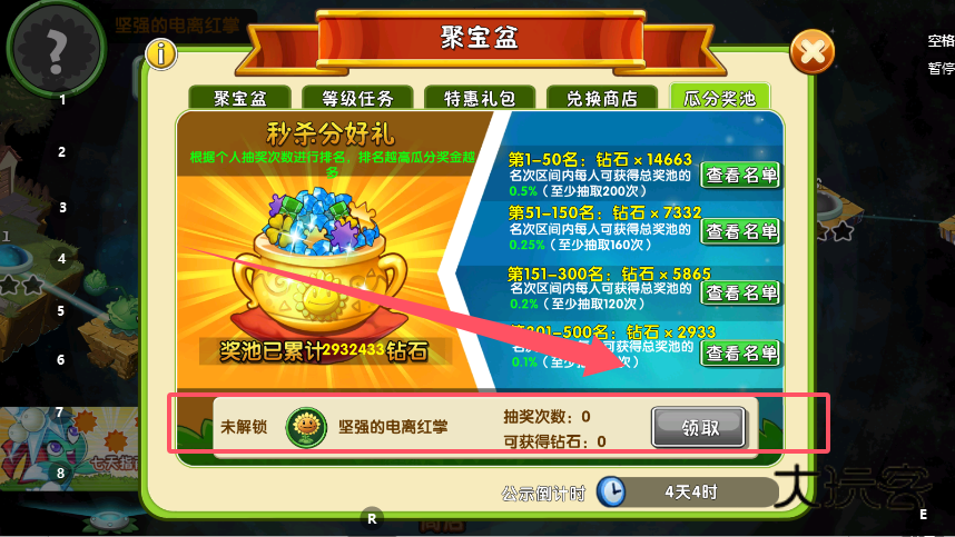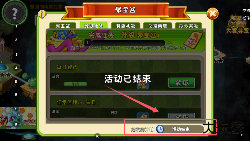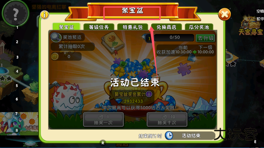 1、开启植物大战僵尸2,在游戏主界面醒目位置找到“天宫寻宝”入口,点击进入后能看到上方设有“天宫寻宝”、“特惠礼包”、“累计抽取”、“兑换商店”多个功能标签。