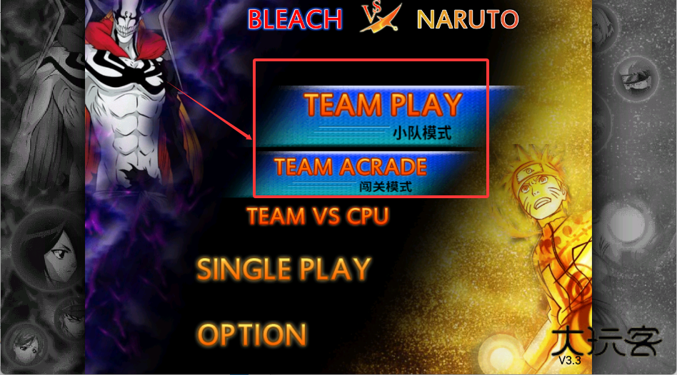 1、启动游戏,主界面背景是酷炫的动漫风格,两侧分别是《BLEACH》和《NARUTO》的代表角色。中间是四个核心功能按钮,最显眼的是“TEAM PLAY”小队模式。