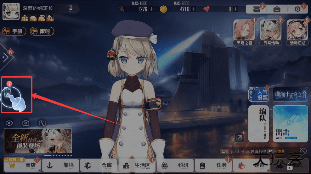 4、所有已拥有的舰娘都会在“船坞”中管理,你可以在这里查看她们的属性,进行强化或锁定等重要操作。
