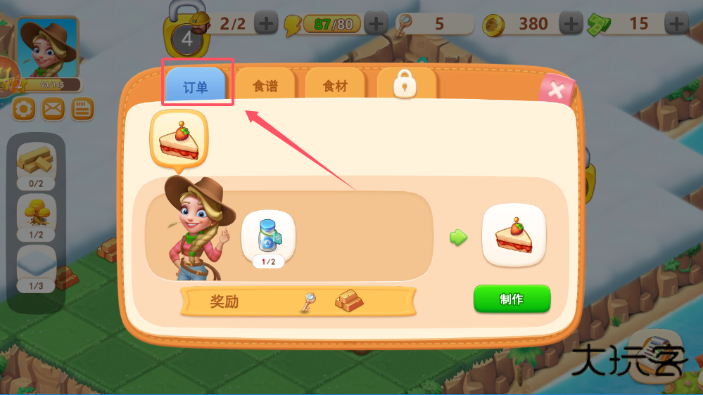 2、订单系统是你赚取资源的主要途径,牛仔角色会发布制作蛋糕等任务。接到订单后要检查食材是否充足,比如5/2的罐子表示需要5个罐子完成制作。