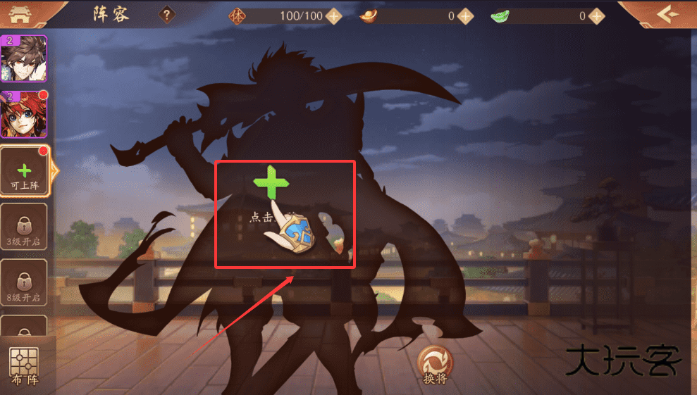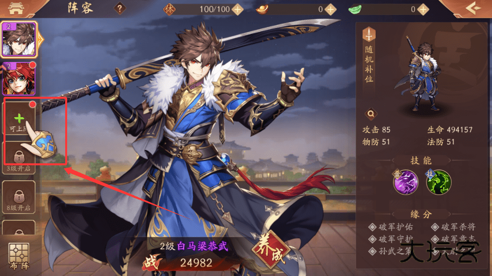 1、界面上会显示可上阵位置和开启等级,3级和8级各解锁一个位置,记得先满足等级条件哦。