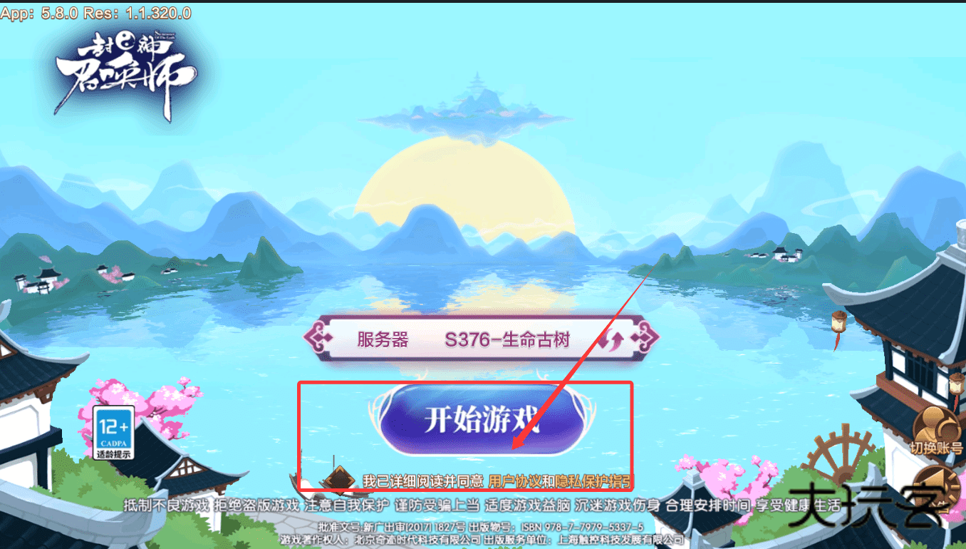 1、游戏启动后首先选取合适的服务器,例如“S376-生命古树”,并仔细阅读相关协议与健康提示,确认后点击开始按钮即可进入角色创建阶段。