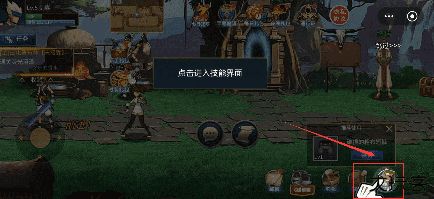 2、初期系统会“推荐使用”一些基础装备,比如“破损的粗布短裤”,虽然属性普通,但前期凑合着用没问题,后续再慢慢更换。
