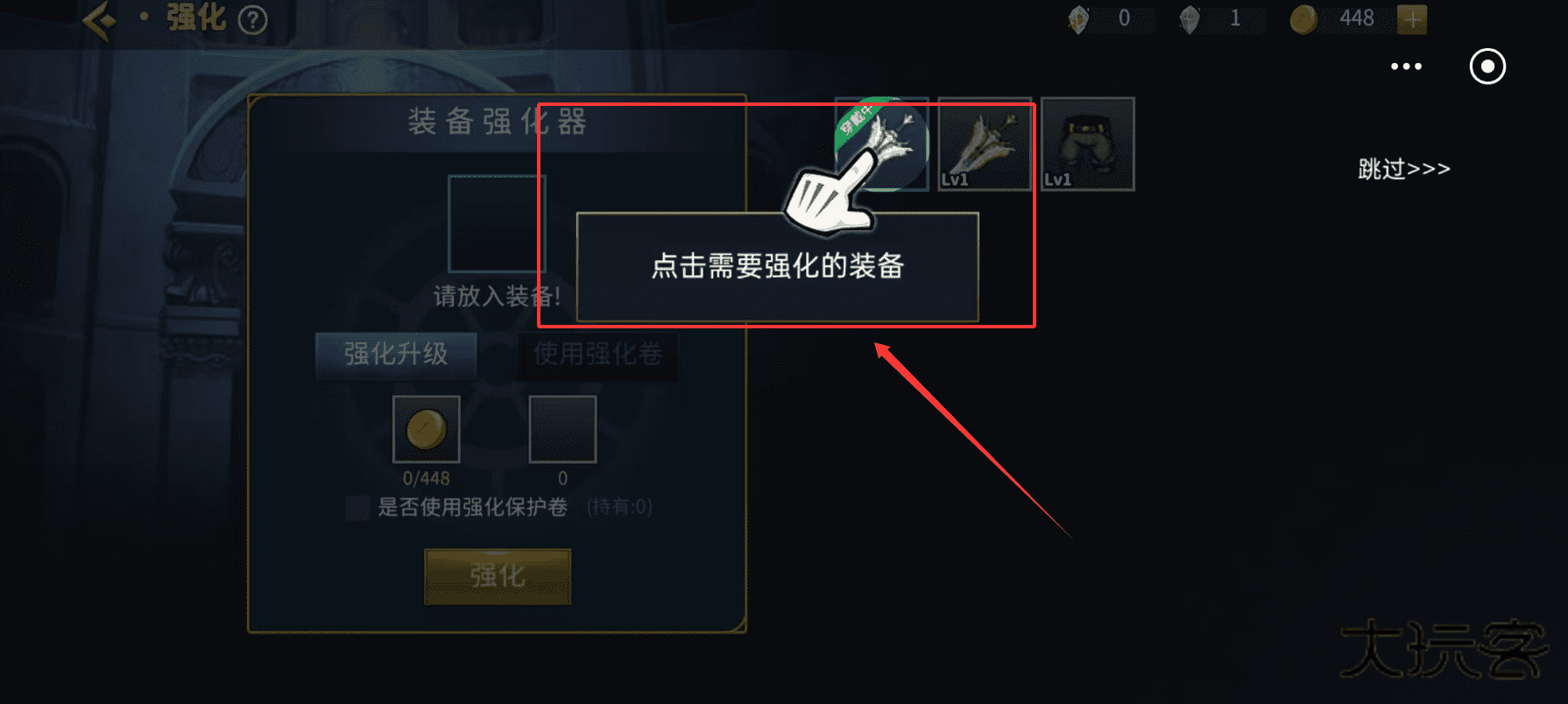 3、这时要把想强化的装备放进去,注意看下方强化材料的需求数量,比如“0/448”表示还需要很多材料。