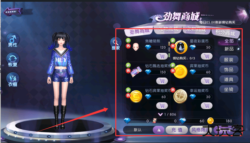 3、通过“搜索”或“风格筛选”找到想要的服装,饰品或坐骑,留意“钻石甄选抽奖”和“积分商城”板块,每日“00刷新”后可能会有新货上架,选好后加入“购物车”统一购买就好。