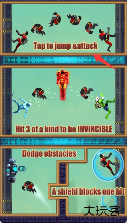 点击游戏画面能够让超人跳转并杀死敌人;连续杀死三个敌人减少你的电力损失;