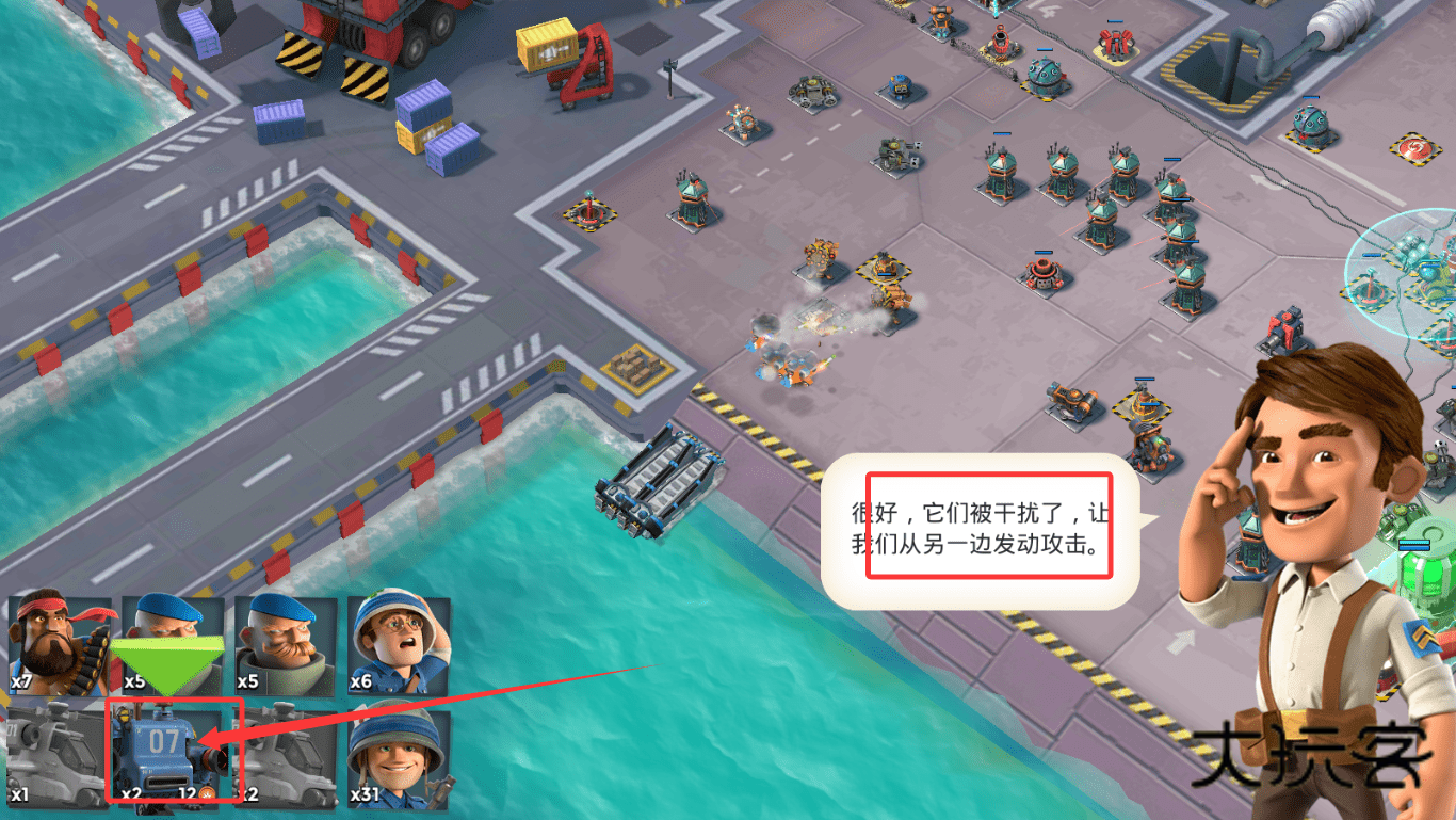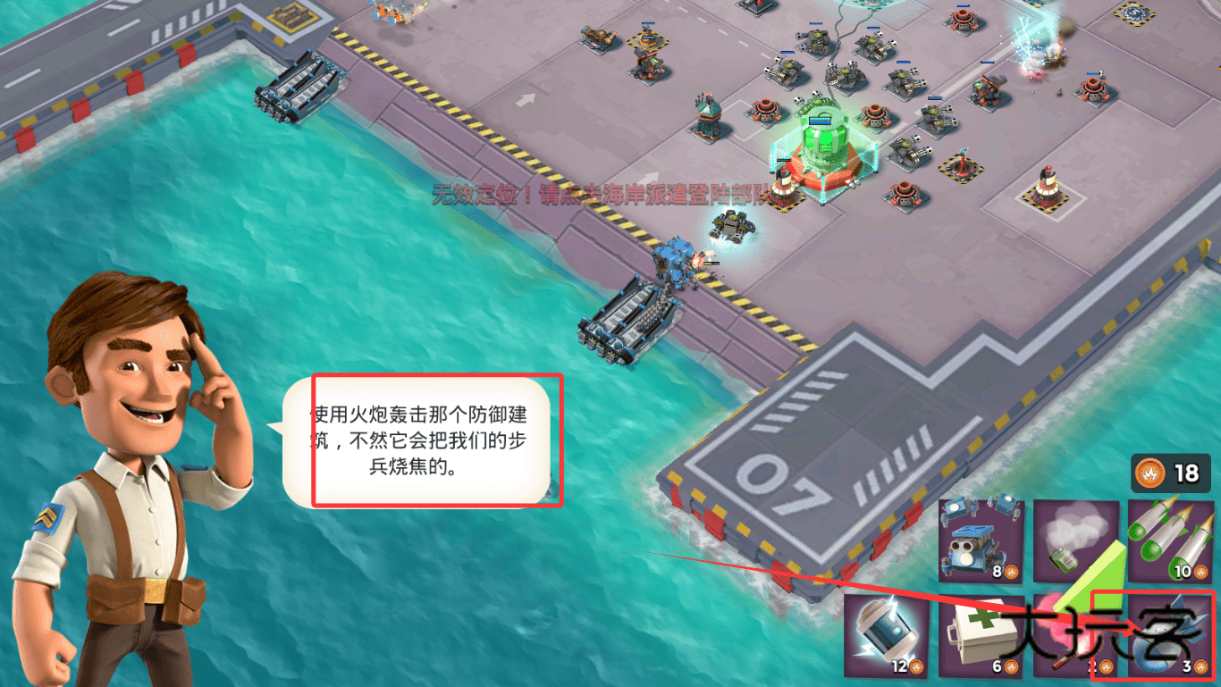 3、当空中单位吸引并干扰了敌方防御后,引导会提示转变进攻方向。此时需要根据指令,在合适的海岸线位置点击,以派遣登陆部队上岸,建立地面进攻阵地。