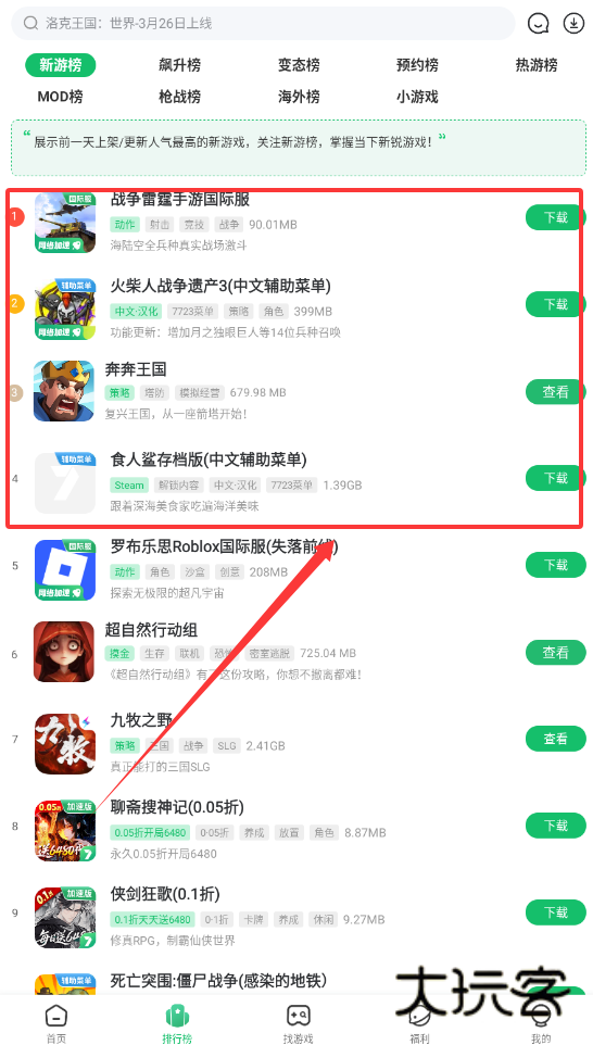 1、打开“新游榜”或“MOD榜”,比如战争雷霆手游国际版或火柴人战争遗产3中文辅助菜单,找到想玩的游戏后。