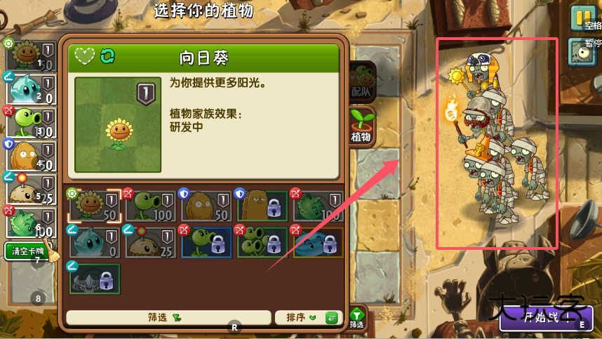 2、界面上方“选择你的植物”标识旁设有智能筛选按钮,左侧清晰标注每种植物的阳光消耗与特性参数,方便根据战场需要快速搭配,这套分类系统让战术准备变得高效直观。