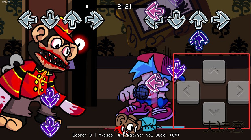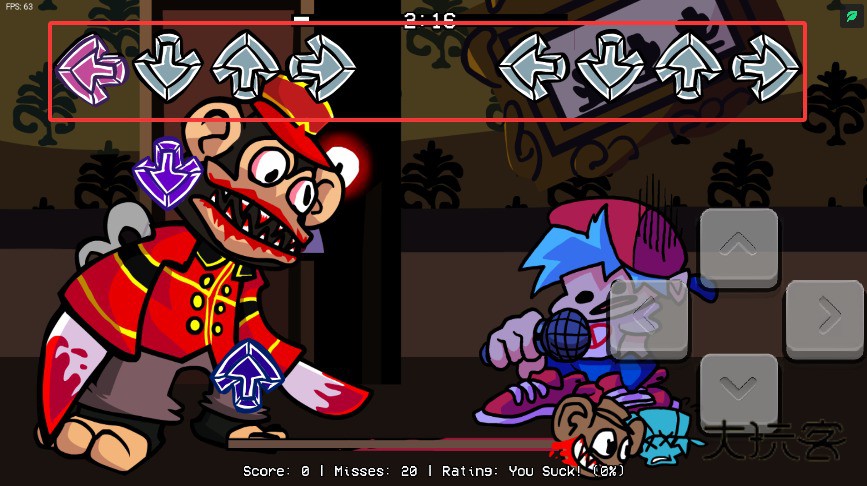 3、根据屏幕上方下落的箭头提示符号,使用右下角方向键进行精准按键演奏操作。
