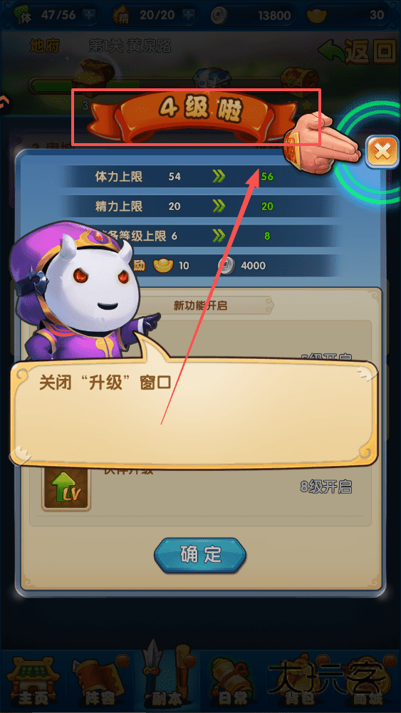 2、胜利后角色会升级,注意属性提升,关闭升级窗口就能继续玩了呢。