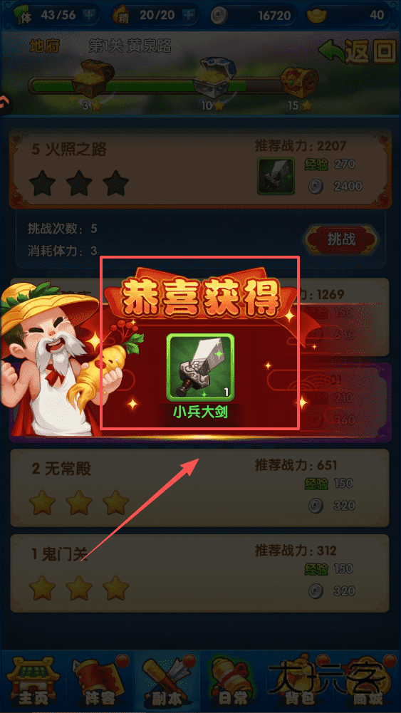 4、还可探索副本获取装备,比如挑战火照之路,成功后会有装备弹窗提示哟。