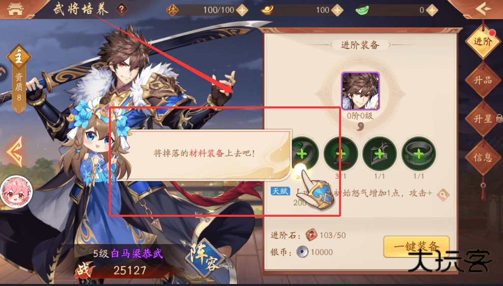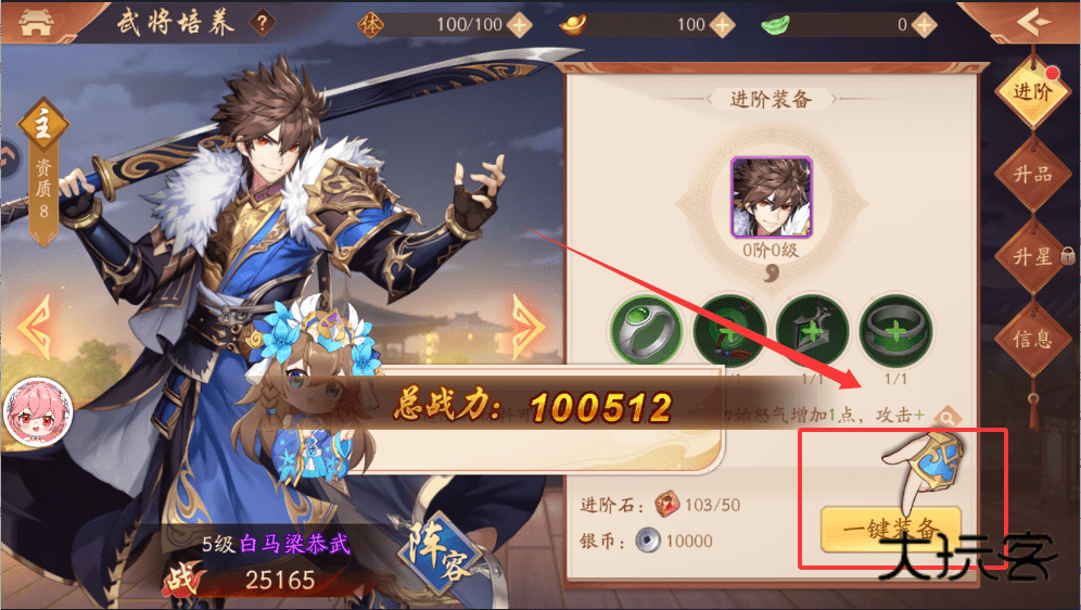 1、你可以看到升级,进阶、装备等选项。优先使用经验道具将武将升到满级,比如100级,这是提升基础属性的最快方式。