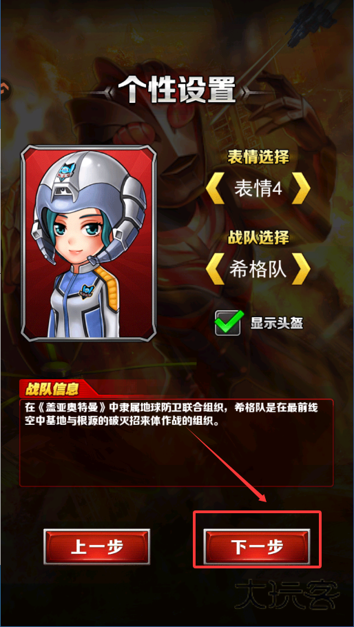 2、创建角色时,需要在“选择性别”界面挑选一个你喜欢的初始形象。默认名字是“旗木大辉”,选好后,点击下方的红色“下一步”按钮确认就可以啦。