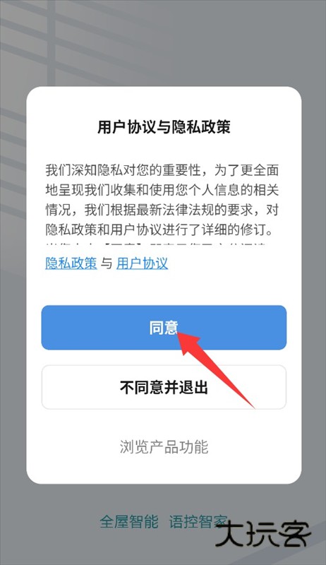 1、启动应用后弹出用户协议与隐私政策,需点击同意按钮方可进入登录注册界面。
