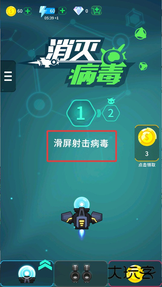 4、进入游戏后,通过滑动屏幕控制飞机移动,并自动或手动射击出现的病毒目标。躲避敌方攻击的同时尽可能消灭更多病毒。