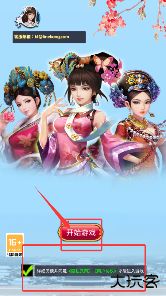 1、初次进入游戏需在启动界面查阅适龄提示并确认同意相关协议,随后点击“开始游戏”加载资源。